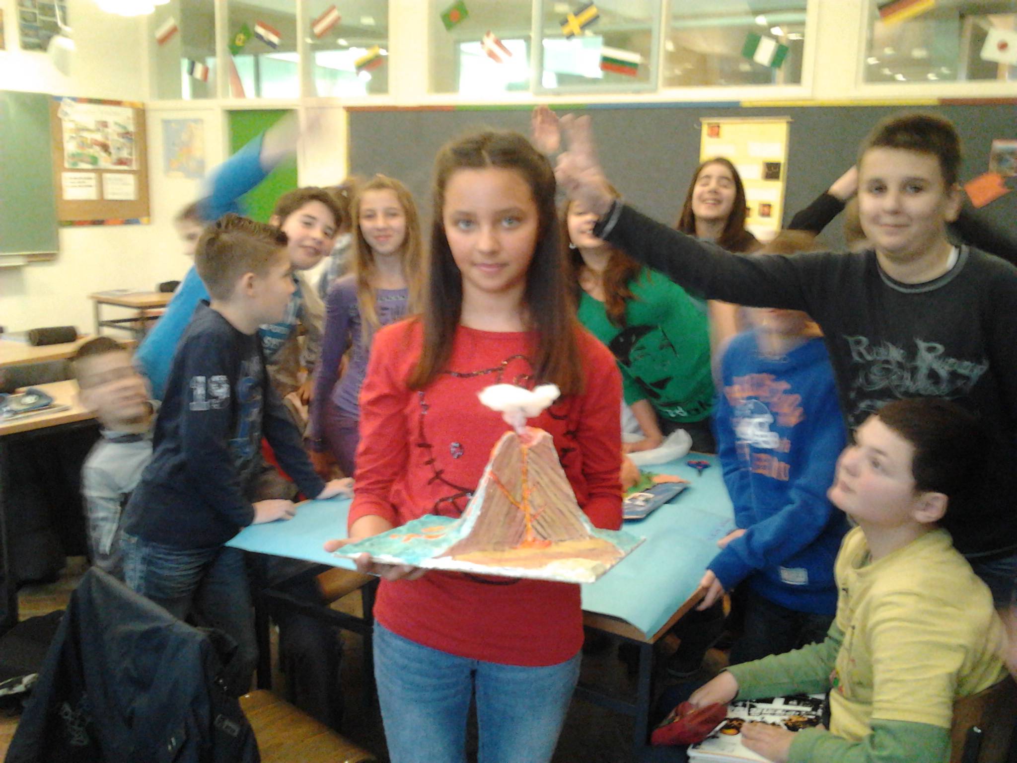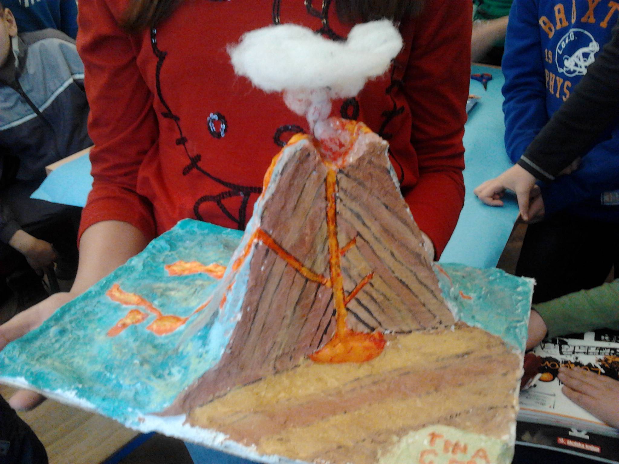 Na satu geografije učili smo o vulkanima. To je nadahnulo Tinu Gizdić, Mateu Parat i Bornu Todorića da naprave modele vulkana. Svi su se odmah bacili na posao. Tina je napravila vulkan od gipsa, tempera i malo pamuka. Borna i Matea su se nakon nekoliko dana sastali i započeli raditi vulkan. Njih dvoje su uzeli materijal za rad. Vulkan su napravili tako što su uzeli karton i uz pomoć valjka za tijesto spljoštili glinamol. Uzeli su staklenu bocu od cocte, stavili je na sredinu kartona, oko nje su stavili zgužvane novine i glinamolom su oblikovali vulkan. Pokraj vulkana napravili su brdašce, a nešto podalje od vulkana i gradić uz more. Na moru je bilo nekoliko jedrilica. Kuće u gradiću i jedrilice napravljene su od plastelina. Iza vulkana nalazi se šuma koja je napravljena od nekoliko borovih grančica koje su poslužile kao drveće. Na kraju su obojili glinamol temperama u odgovarajuću boju. Na satu geografije prezentirali su svoj vulkan. Borna je u jednoj boci donio jabučni ocat pomiješan s crvenom temperom. Tu smjesu je ulio u bocu koja je bila u vulkanu, Matea je dodala sodu bikarbonu i još malo crvene tempere. Malo smo sačekali i tada je iz vulkana počela izlaziti crvena pjena koja je izgledala poput prave lave i sve je izgledalo kao prava erupcija. Svi smo bili zadivljeni time što su Borna i Matea napravili. Tinin vulkan je isto bio odličan, a on je predstavljao presjek vulkana i sve njegove dijelove. Svi troje su zasluženo dobili petice. Na kraju bih samo htjela dodati da bez pomoći mojih prijatelja Mateje i Borne ne bih mogla ovako detaljno opisati čitav postupak izrade vulkana da mi oni cijeli postupak svog rada nisu zorno opisali.