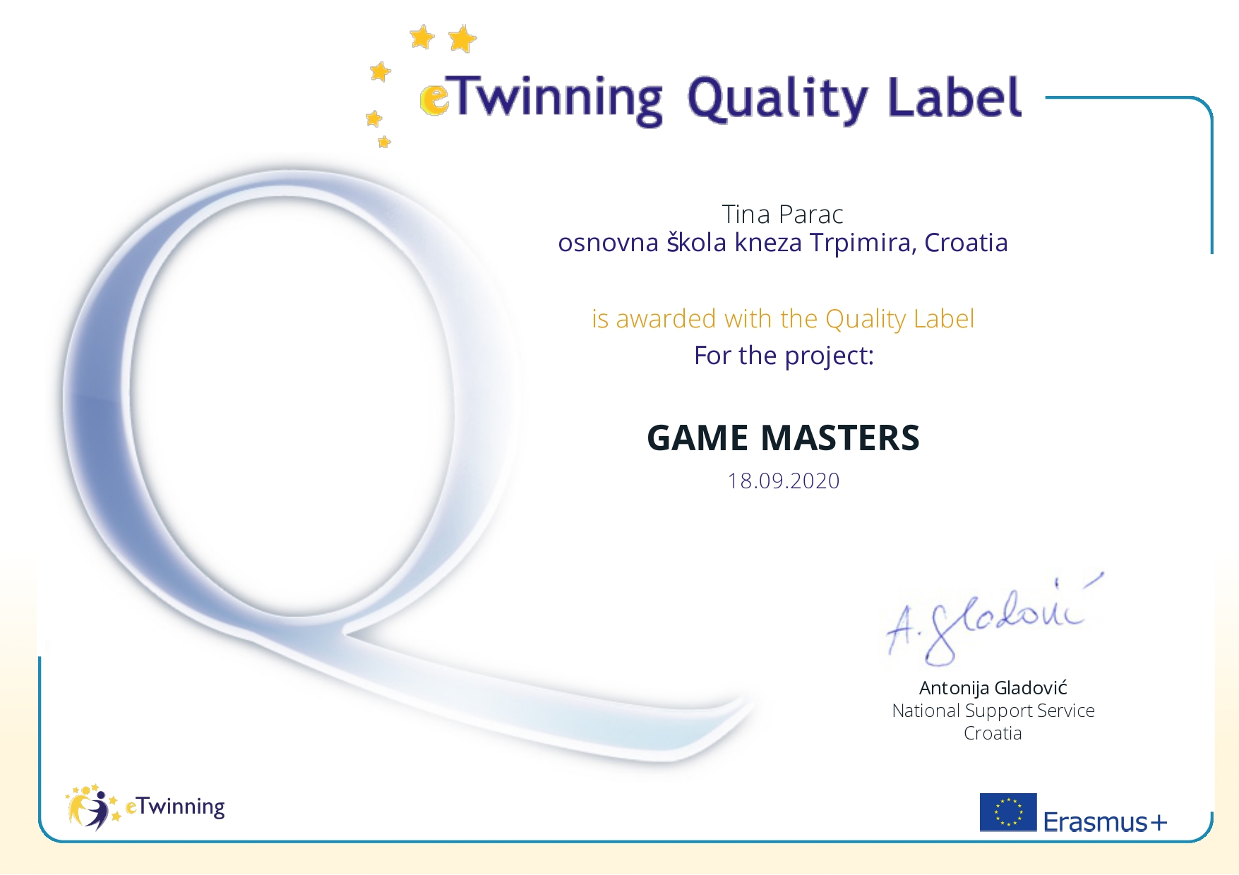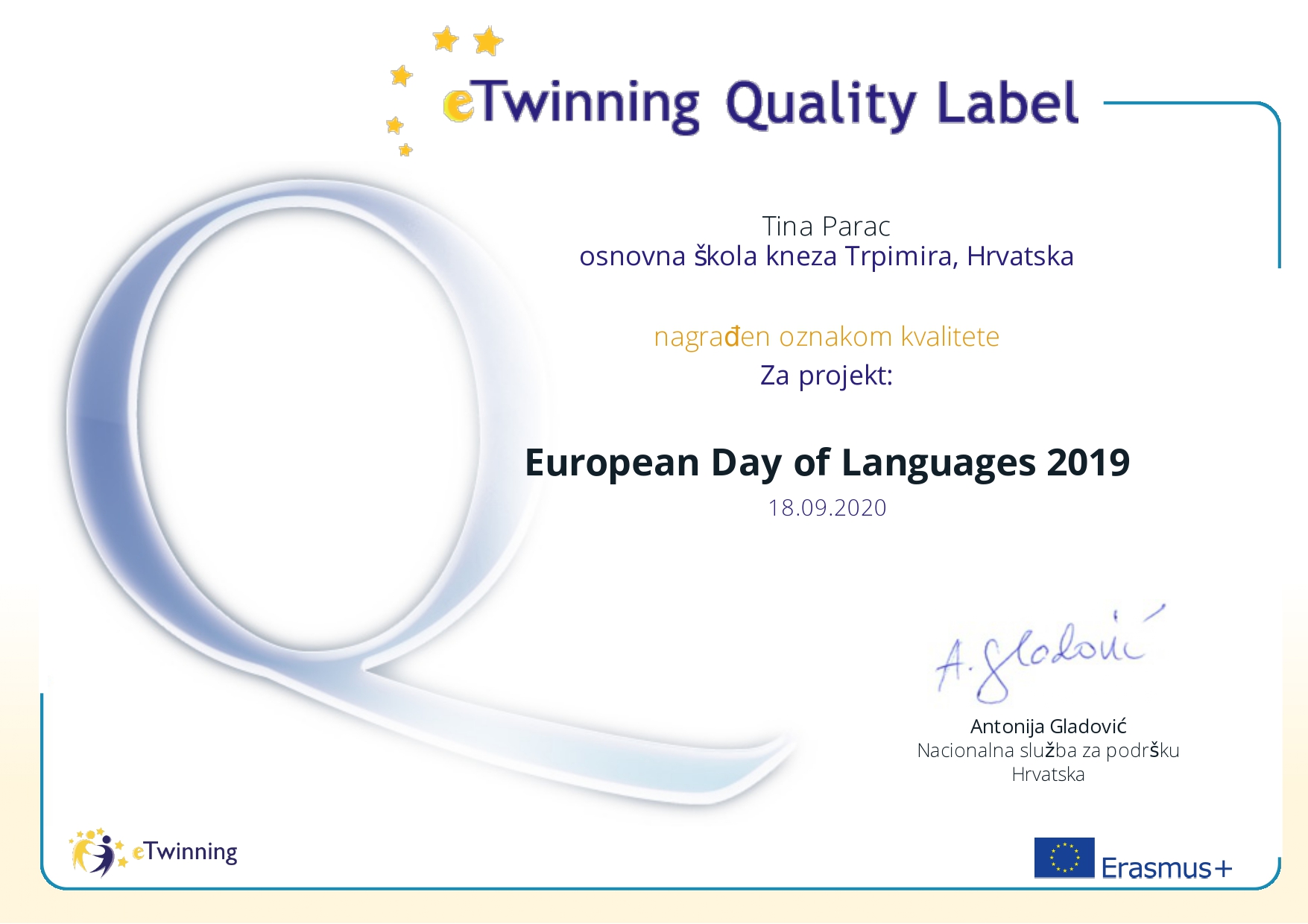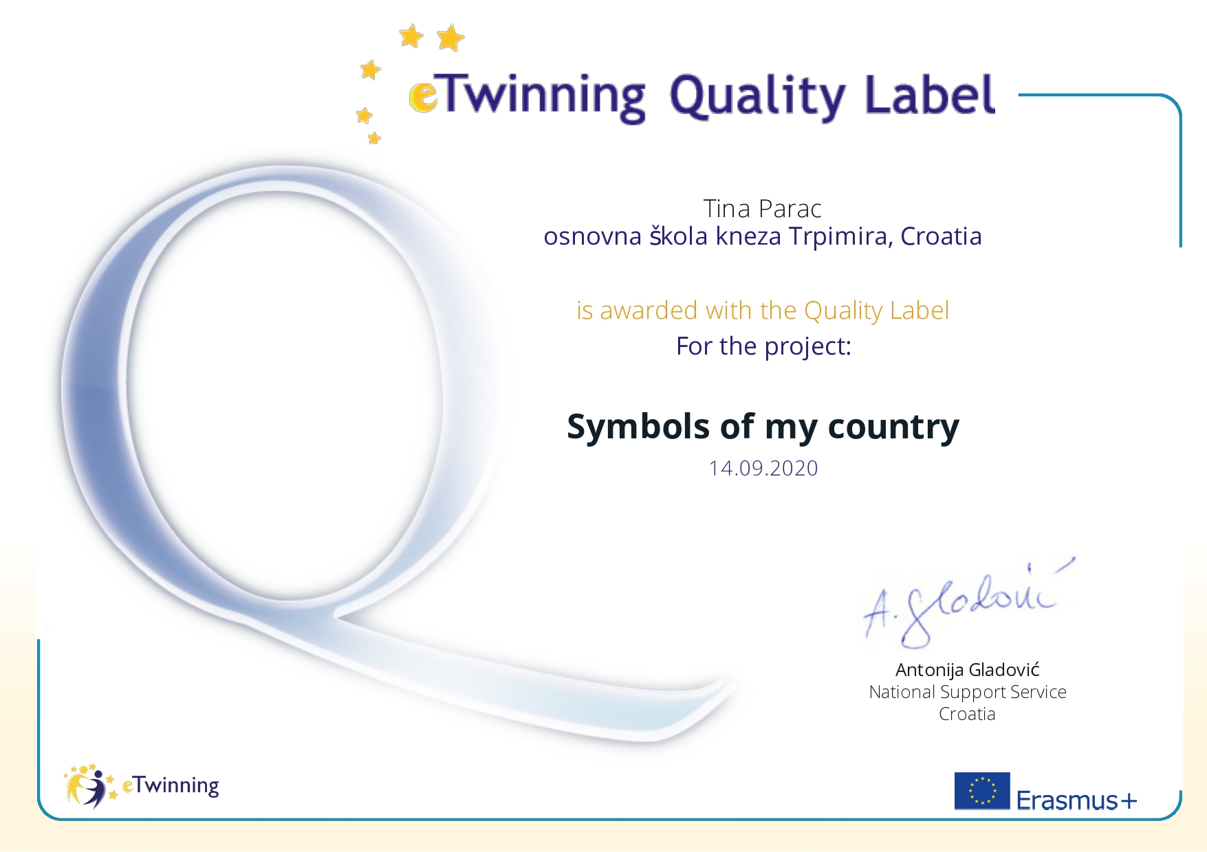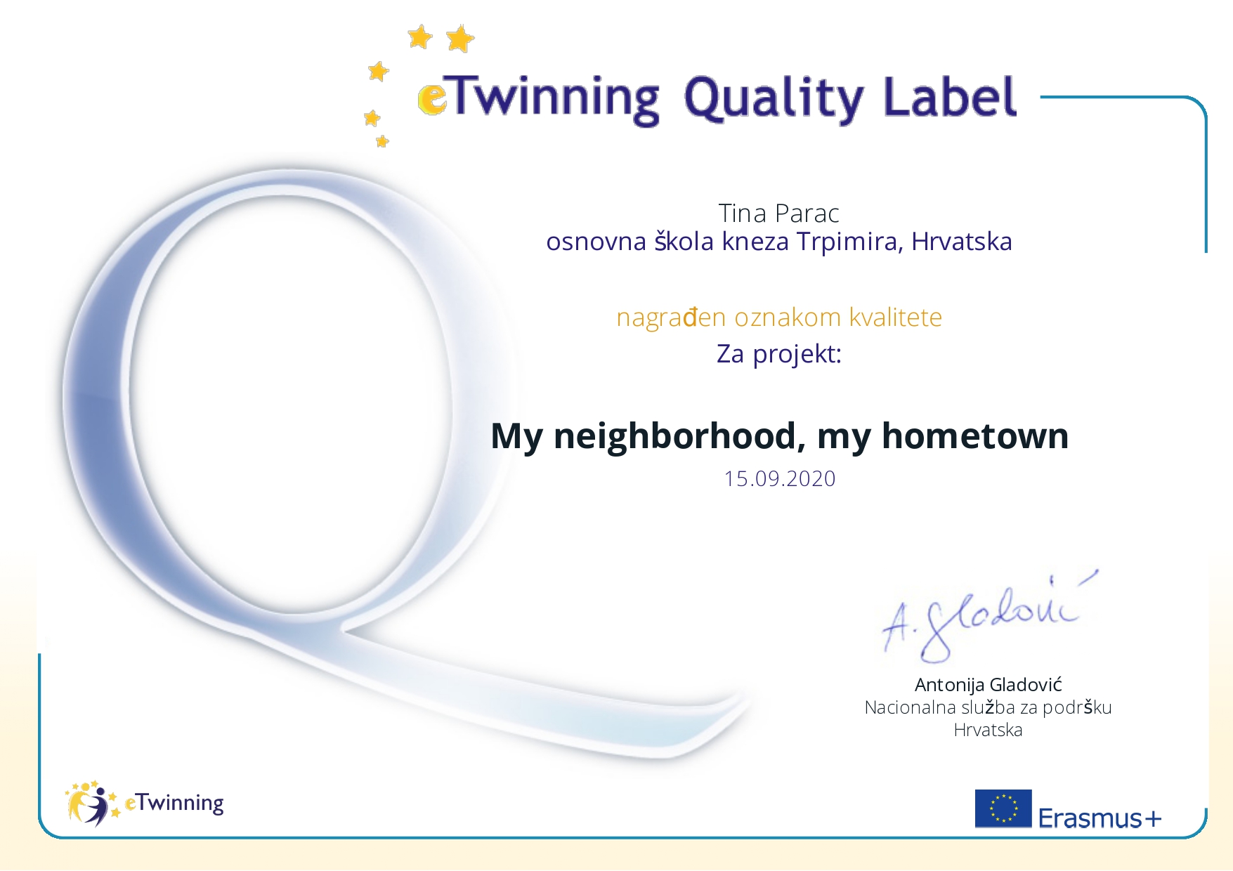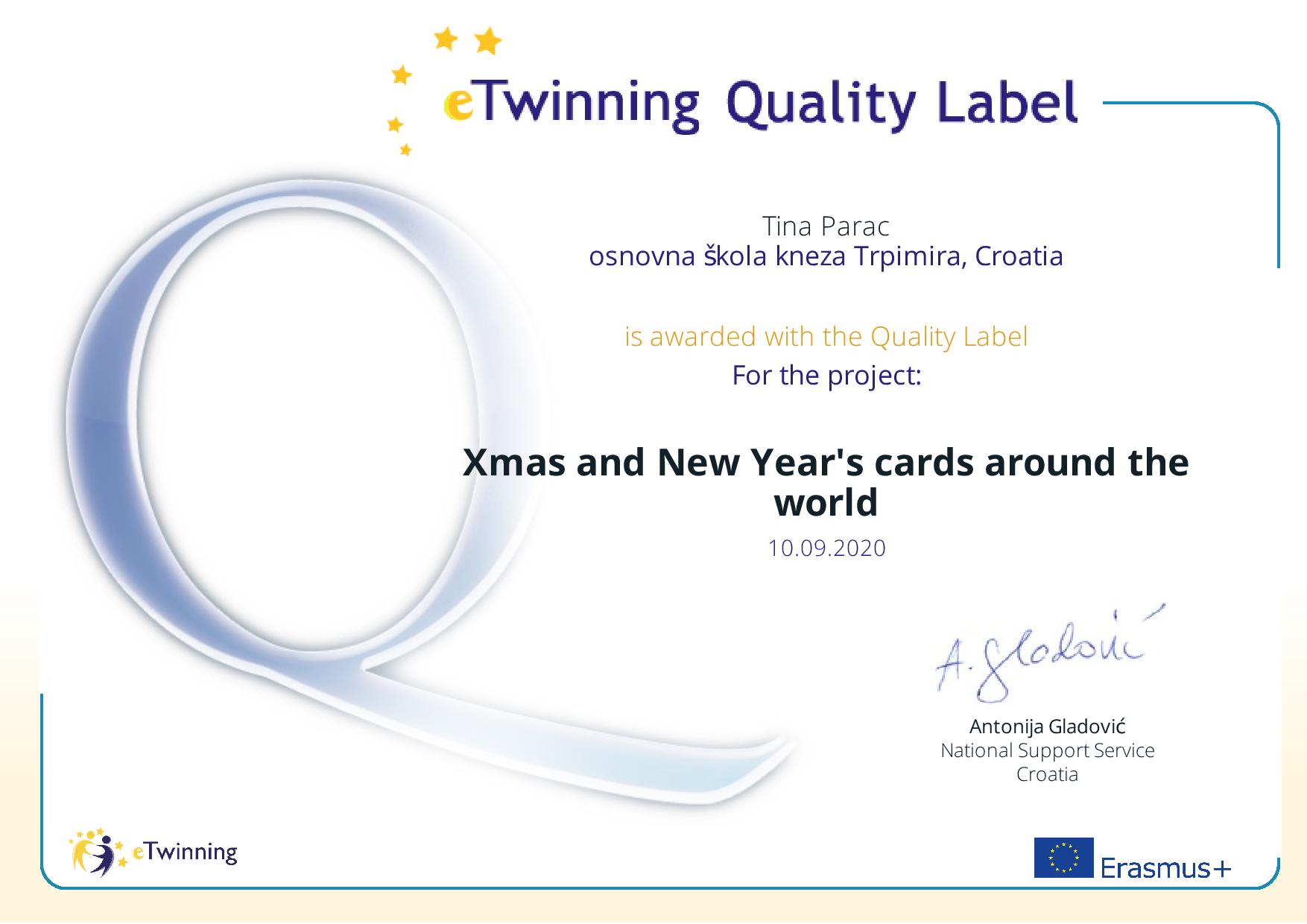 Početkom nove školske godine u našu školu ponovno su stigle lijepe vijesti iz eTwinning zajednice. Središnja služba za podršku eTwinningu iz Hrvatske dodijelila je Nacionalne oznake kvalitete za rad na eTwinning projektima realiziranim u školskoj godini 2019./2020. na kojima su sudjelovali učenici 3.b, 5.a, 6.a, 6.b i 6.e razreda pod mentorstvom profesorice engleskog i talijanskog jezika Tine Parać.